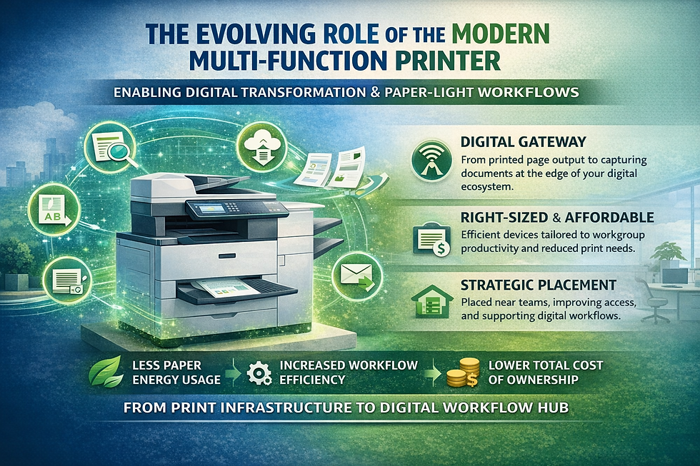 Just as importantly, this shift toward digitization and reduced printing is fundamentally changing how organizations think about and invest in print technology itself. From Output Device to Digital Gateway Modern MFPs are no longer defined solely by their ability to produce printed pages. They now serve as intelligent gateways between physical and digital information. High-speed scanning, optical character recognition (OCR), and seamless integration with document management systems allow paper documents to be instantly transformed into searchable, shareable digital assets. Invoices, contracts, on-boarding forms, and customer records can move directly from the device into secure workflows and cloud repositories, eliminating manual steps and accelerating business processes. In many organizations, the MFP is the first touch point in the digitization journey, capturing information at the edge and feeding it into the broader digital ecosystem. Printing Less Is Changing Everything As digital workflows mature, one outcome is clear: organizations simply do not need to print as much as they once did. Electronic approvals, digital signatures, cloud collaboration, and secure document sharing are steadily replacing paper-based processes. This reduction in print volume does more than support sustainability goals it reshapes how organizations evaluate print infrastructure. The era of centralized, over-sized, and expensive multi-function printers designed to handle massive print volumes is fading. Instead, businesses are recognizing that printing is now a support function, not the core purpose of the device. As the shift to Right-Sized, Affordable MFPs gains momentum with less reliance on printing, organizations are increasingly favoring right-sized MFPs that are designed for work group efficiency rather than maximum output. These devices are significantly more affordable than the large, high-capacity MFPs of the past often costing a fraction of what legacy systems once required. Rather than investing tens of thousands of dollars in a single centralized machine, companies can now deploy multiple smaller, cost-effective MFPs strategically throughout the office. This distributed approach delivers several advantages: Improved accessibility: Employees spend less time walking to a central print room and more time focused on productive work. Reduced bottlenecks: Work groups have direct access to scanning and printing when needed, without competing for a single device. Higher resilience: If one device is unavailable, others continue to support operations. Lower upfront investment: Affordable equipment aligns better with reduced print volumes and modern budget expectations. This shift reflects a broader change in mindset: MFPs are no longer purchased for maximum output, but for their role in enabling digital workflows efficiently and economically. Efficiency Through Strategic Placement The combination of right-sized MFPs and strategic placement transforms office efficiency. Devices are positioned where work happens near teams, departments, or collaboration spaces supporting quick scanning, secure release printing, and seamless integration with digital systems. Because these MFPs are designed for energy efficiency and lower consumable usage, operating costs are reduced alongside capital expenses. Print management software further enhances efficiency by providing insight into usage patterns, reinforcing policies that encourage printing only when necessary. Environmental Benefits Amplified Immediate environmental benefits: reduced paper consumption, lower toner usage, less waste, and decreased energy demand. When paired with smaller, energy-efficient MFPs, these benefits are amplified. Organizations reduce their carbon footprint not only by cutting print volumes, but also by deploying equipment that consumes less power, requires fewer resources to manufacture, and supports longer, more sustainable life-cycles.